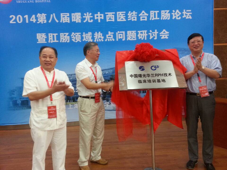 金秋大地、陽光明媚。2014年8月30日上海曙光醫院與江蘇華楊醫療科技有限公司套扎器技術臨床培訓基地揭牌會在上海曙光醫院東西兩院隆重舉行。出席人員由華蘭股份董事長華國平先生、上海市黃浦區衛生局王文健局長、上海市曙光醫院陳朝文院長、上海市曙光醫院肛腸專家楊巍教授等。