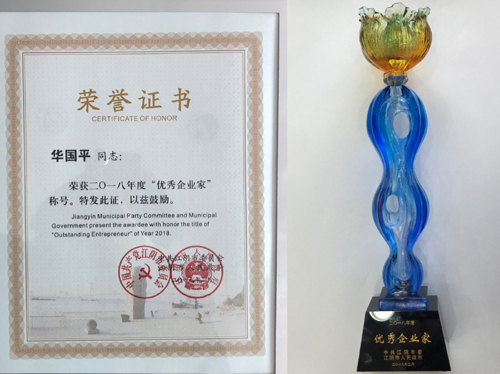 表彰會上,公司董事長華國平先生榮獲2018年“江陰市優秀企業家”稱號,全市共評選表彰優秀企業家35名。